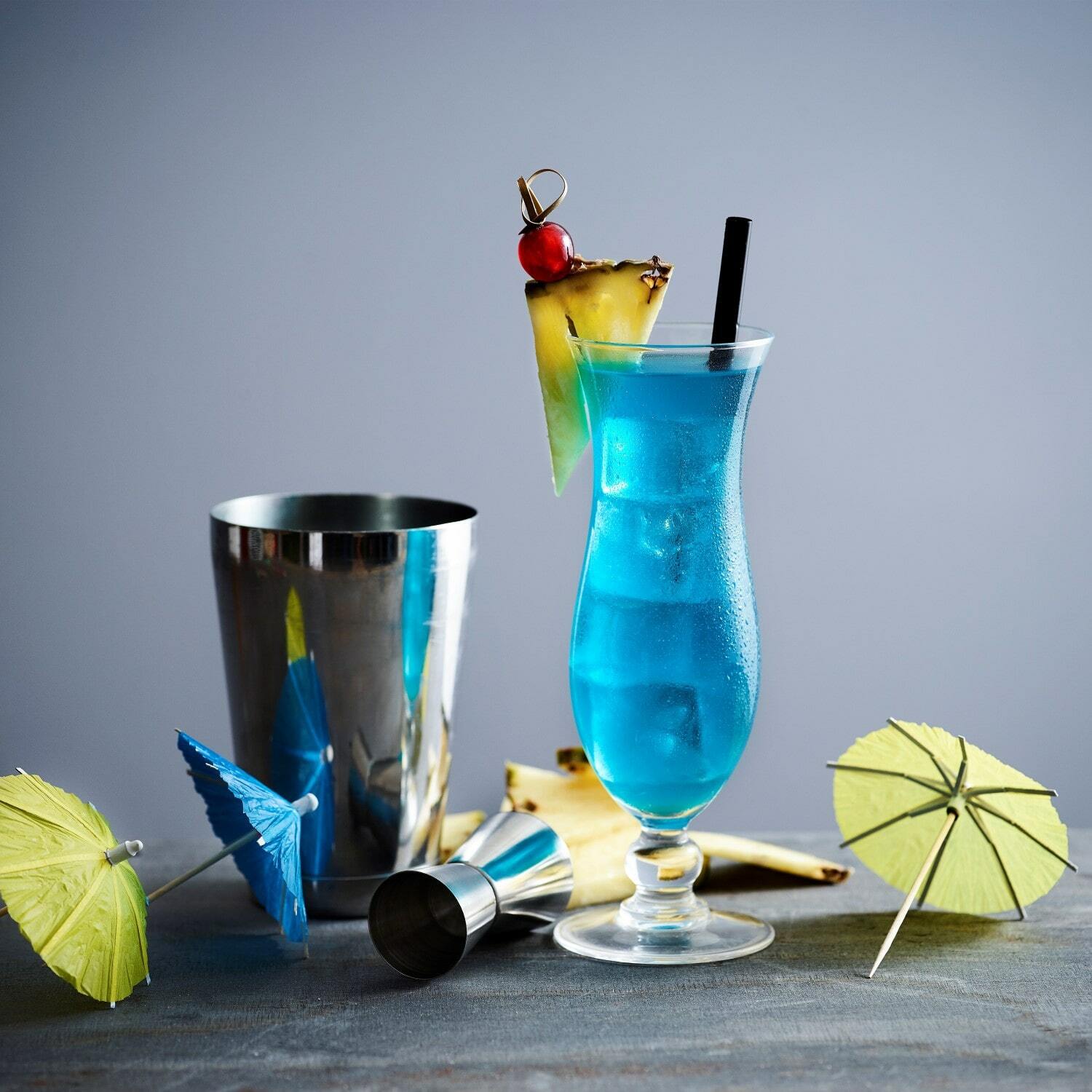Eksotisk, forfriskende cocktail lavet med blandt rom, ananasjuice og Shake-It Mixer Blue Curaco.