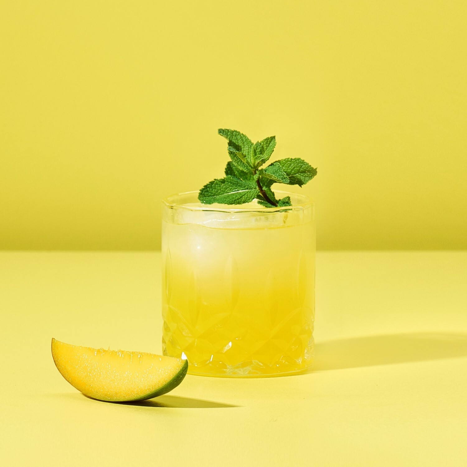 - Pynt med en halv skive mango og et par mynteblade